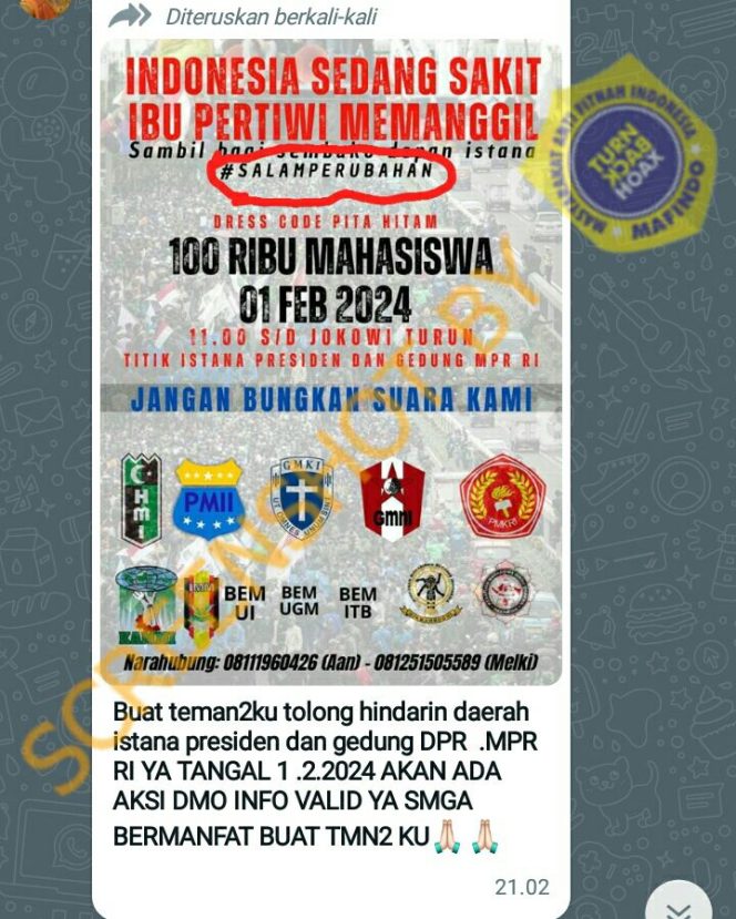 Beredar sebuah pesan berantai melalui aplikasi pesan Whatsapp, tentang pemberitahuan mengenai aksi demo yang akan dilakukan oleh 100 ribu mahasiswa dari seluruh Indonesia. Menurut informasi yang tercantum di dalam lampiran selebaran, demo yang bertajuk “Geruduk Istana” ini akan dilakukan pada tanggal 1 Februari 2024 di depan Istana Presiden dan Gedung MPR RI. Demo ini dilakukan dalam rangka mendesak MPR agar segera melakukan sidang istimewa untuk menurunkan Jokowi dari jabatannya sebagai presiden. Terlihat pula beberapa logo organisasi dan badan eksekutif mahasiswa yang diklaim terlibat dalam aksi demo ini. Lalu apakah benar, bahwa akan ada demo “Geruduk Istana” yang dilakukan oleh 100 ribu mahasiswa pada tanggal 1 Februari 2024 untuk menurunkan Jokowi?