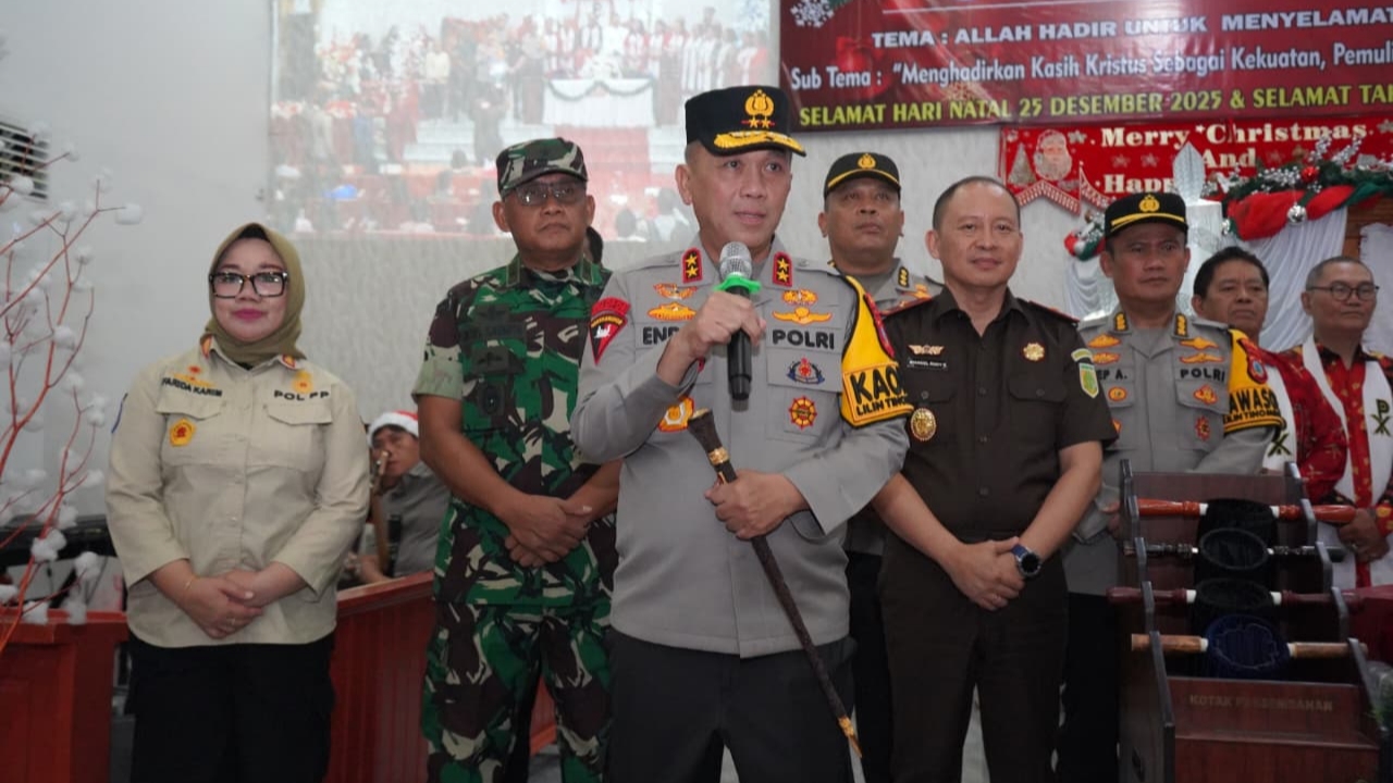 Kapolda Sulawesi Tengah Irjen Pol Endi Sutendi memimpin patroli pengamanan dan pengecekan gereja-gereja di Kota Palu menjelang pelaksanaan ibadah Malam Natal 2025, Rabu malam (24/12/2025). Kegiatan ini dilakukan untuk memastikan situasi keamanan dan ketertiban masyarakat tetap kondusif selama perayaan Natal.