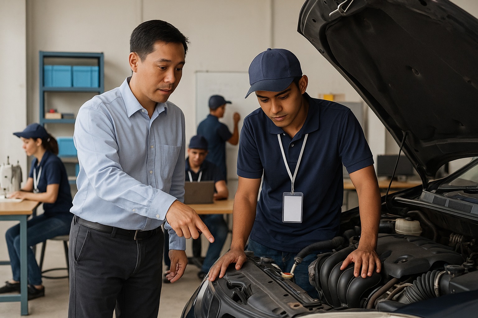 Peserta pelatihan di Balai Latihan Kerja mengikuti praktik otomotif yang dibimbing instruktur, sementara peserta lain menjalani pelatihan keterampilan seperti menjahit dan teknologi informasi. Ilustrasi. Foto: AI-PPID